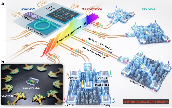 2026年2月11日,北京大学物理学院现代光学研究所王剑威教授、龚旗煌教授团队与电子学院常林研究员团队在国际顶级学术期刊《自然》上发表了题为“基于集成光量子芯片的大规模量子通信网络”(Large-scale quantum communication networks with integrated photonics)的突破性研究成果。研究团队成功研制出全功能集成的高性能量子密钥发送芯片与光学微腔光频梳光源芯片,并在此基础上构建了全球首个基于集成光量子芯片的大规模量子密钥分发网络——“未名量子芯网”。该量子网络支持20个芯片用户并行通信,两两通信距离达370公里并打破无中继界限,组网能力(客户端对数 × 通信距离)达3700公里,在芯片用户规模与组网能力上均达到国际领先水平。