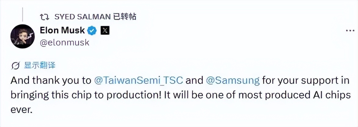 值得注意的是,马斯克在帖子中提及台积电和三星,并肯定了这两家代工厂的贡献。然而,由于他标记了错误的台积电账号,导致社交媒体上出现了一小段混乱。据悉,马斯克在帖子中标记的是@TaiwanSemi_TSC,这是一个与台积电名称相似的台湾半导体公司的账号,而不是台积电的官方账号(TSMC)。